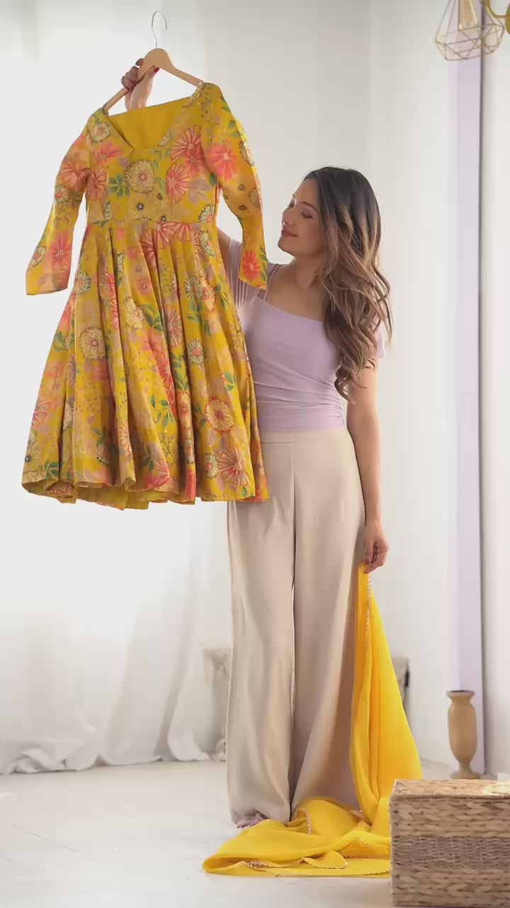 PURE SOFT ROMANSILK CHANDERI DISCHARGE PRINT FABRIC FULLY FLAIR KEDIYA STYLE KURTA,WITH DUPPTA SET,PALAZZO READY TO WEAR*